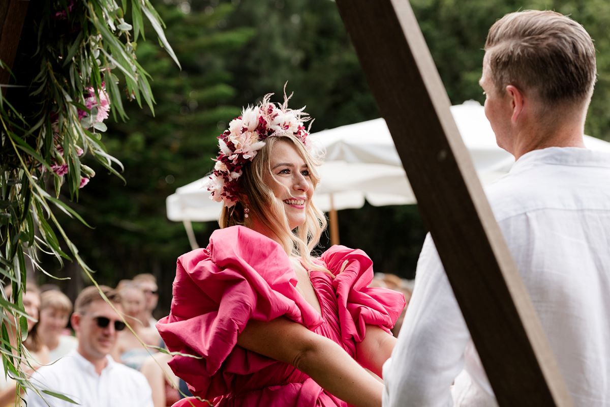 Lauren’s fabulous pink dress was the talk of the season. How perfect for our vibe. Lets face it – this is how to show that you want to do things “a little differently“. Out with the traditional white and in with the hot pink dress. We absolutely love it. (Dress from AJE)